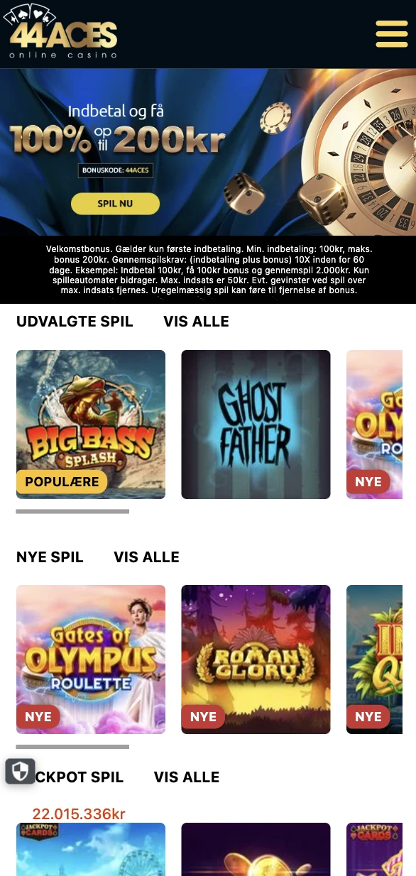 Vores mobile platform passer til en travl dansk hverdag. Du kan tjekke dine tilbud i toget, spille et par runder i frokostpausen eller deltage ved et live-bord hjemme om aftenen. Vi understøtter iOS og Android, og vores udvalg inkluderer spilleautomater, live casino, blackjack, roulette, baccarat, skrabespil, bordspil og video poker. Med omkring 2.800 titler fra Pragmatic Play, NetEnt, Evolution Gaming, Blueprint Gaming, Microgaming, Play'n GO, Red Tiger, Yggdrasil, Big Time Gaming og Merkur holder 44Aces casino i Danmark en stærk variation på mindre skærme.
